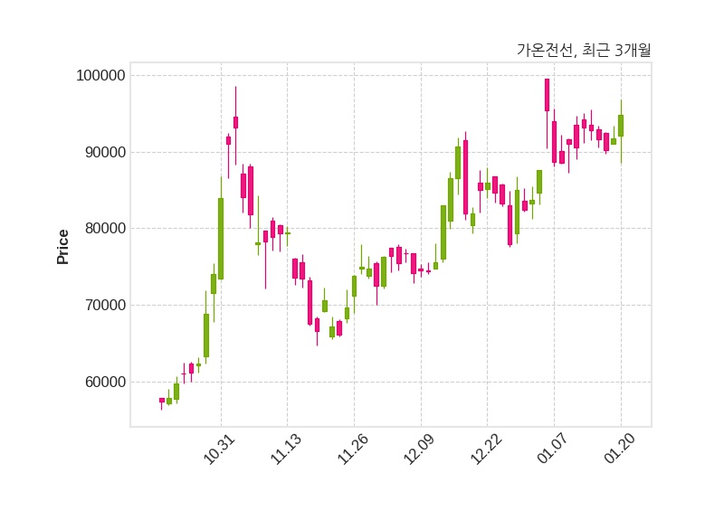 한편, 가온전선의 10시 08분 현재주가는 94,800원으로 직전 거래일 대비 3,100원(+3.38%) 상승이며, 거래량은 30,565주이다.