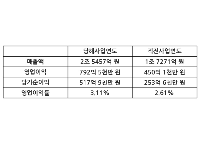 이번사업연도의 매출액은 직전사업연도 대비 47.4% 증가한 2조 5457억 원, 영업이익은 792억 5천만 원, 당기순이익은 517억 9천만 원이라고 공시했다.