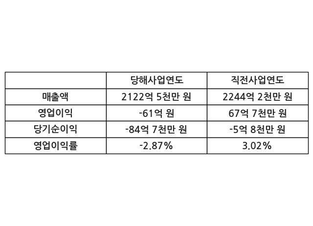 이번사업연도의 매출액은 직전사업연도 대비 -5.42% 감소한 2122억 5천만 원, 영업이익은 -61억 원, 당기순이익은 -84억 7천만 원이라고 공시했다.