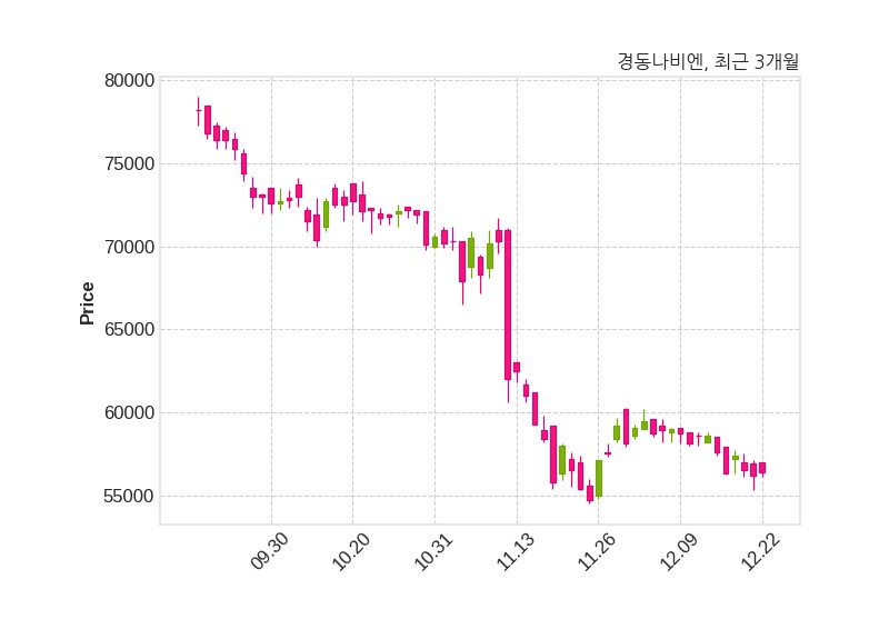 한편, 경동나비엔의 15시 10분 현재주가는 56,400원으로 직전 거래일 대비 200원(+0.36%) 상승이며, 거래량은 18,810주이다.