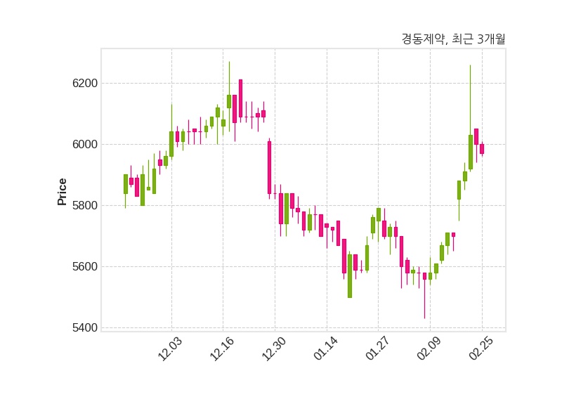 한편, 경동제약은 장 마감 이후 해당 기업공시를 발표했으며 오늘 종가가 5,970원, 거래량은 49,287주로, 직전 거래일 대비 30원(-0.5%) 하락했다.