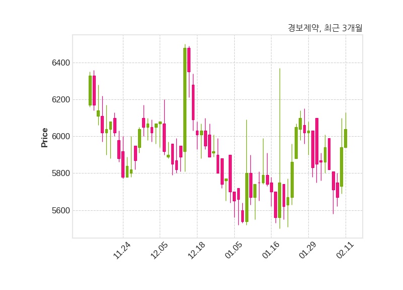 한편, 경보제약의 14시 36분 현재주가는 6,040원으로 직전 거래일 대비 100원(+1.68%) 상승이며, 거래량은 68,131주이다.
