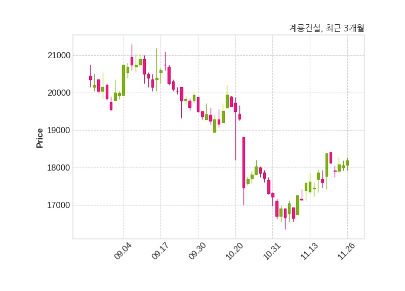 한편, 계룡건설산업의 13시 31분 현재주가는 18,190원으로 직전 거래일 대비 140원(+0.78%) 상승이며, 거래량은 28,894주이다.