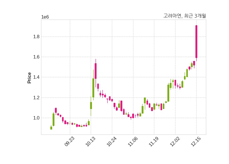 한편, 고려아연은 장 마감 이후 해당 기업공시를 발표했으며 오늘 종가가 1,592,000원, 거래량은 118,686주로, 직전 거래일 대비 74,000원(+4.87%) 상승했다.