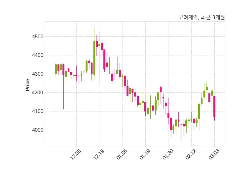 한편, 고려제약의 14시 57분 현재주가는 4,070원으로 직전 거래일 대비 140원(-3.33%) 하락이며, 거래량은 31,546주이다.