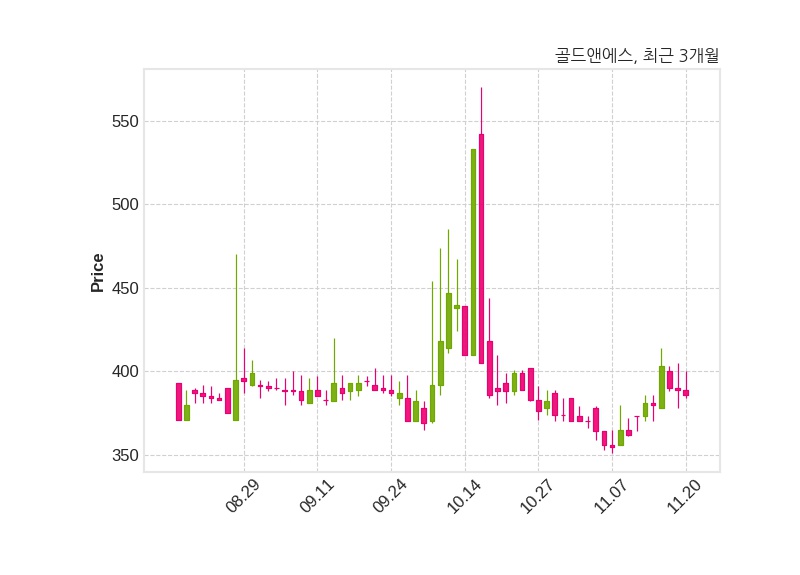 한편, 골드앤에스는 장 마감 이후 해당 기업공시를 발표했으며 오늘 종가가 386원, 거래량은 173,532주로, 직전 거래일 대비 3원(-0.77%) 하락했다.