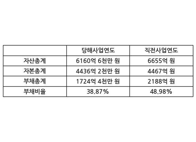 또한, 이번사업연도의 자산총계는 6160억 6천만 원으로 직전사업연도 대비 -7.43% 감소한 한편, 부채총계는 1724억 4천만 원으로 -21.19% 감소, 자본총계는 4436억 2천만 원으로 -0.69% 감소했다.