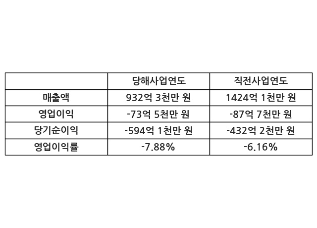 이번사업연도의 매출액은 직전사업연도 대비 -34.53% 감소한 932억 3천만 원, 영업이익은 -73억 5천만 원, 당기순이익은 -594억 1천만 원이라고 공시했다.