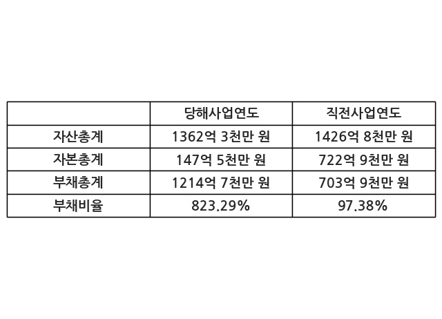 또한, 이번사업연도의 자산총계는 1362억 3천만 원으로 직전사업연도 대비 -4.52% 감소한 한편, 부채총계는 1214억 7천만 원으로 72.57% 증가, 자본총계는 147억 5천만 원으로 -79.59% 감소했다.