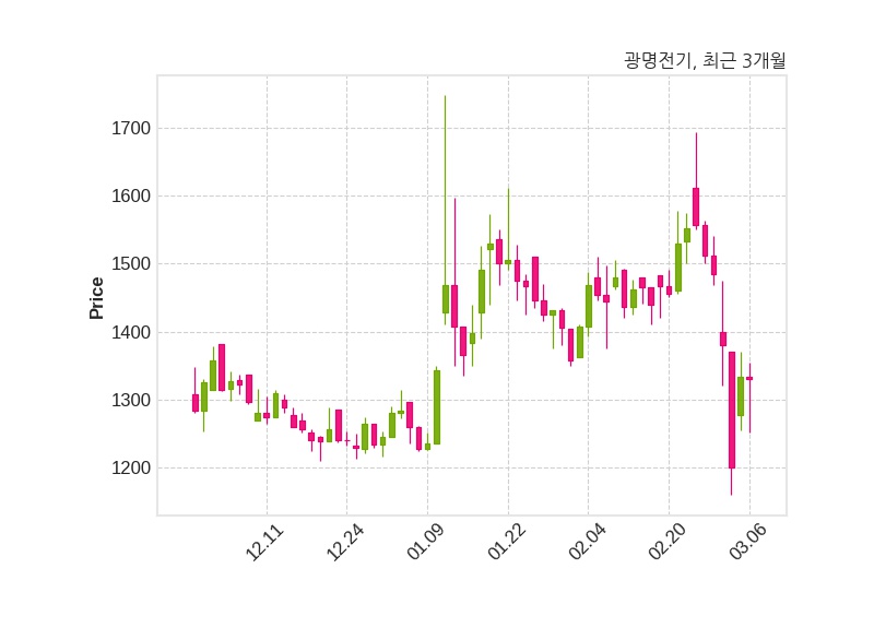 한편, 광명전기는 장 마감 이후 해당 기업공시를 발표했으며 오늘 종가가 1,330원, 거래량은 352,841주로, 직전 거래일 대비 3원(-0.23%) 하락했다.