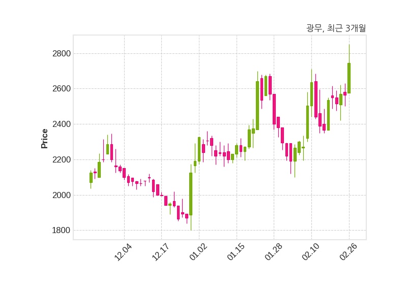 한편, 광무는 장 마감 이후 해당 기업공시를 발표했으며 오늘 종가가 2,745원, 거래량은 930,765주로, 직전 거래일 대비 180원(+7.02%) 상승했다.