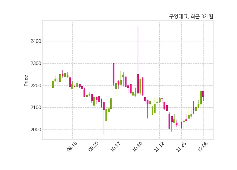 한편, 구영테크는 장 마감 이후 해당 기업공시를 발표했으며 오늘 종가가 2,150원, 거래량은 55,439주로, 직전 거래일 대비 25원(-1.15%) 하락했다.