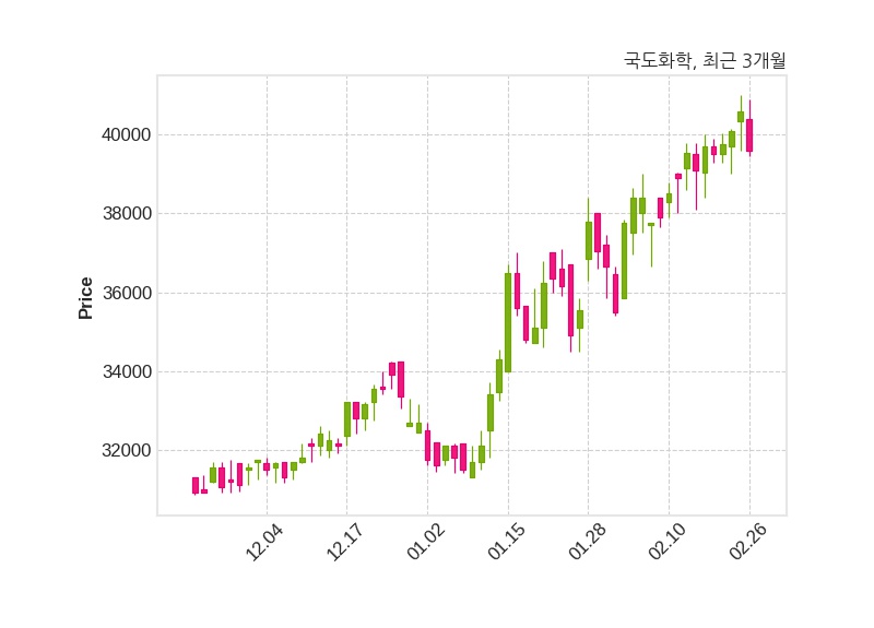 한편, 국도화학의 14시 51분 현재주가는 39,600원으로 직전 거래일 대비 1,000원(-2.46%) 하락이며, 거래량은 11,952주이다.
