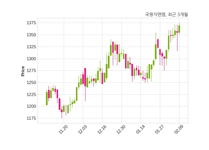 한편, 국영지앤엠은 장 마감 이후 해당 기업공시를 발표했으며 오늘 종가가 1,369원, 거래량은 196,536주로, 직전 거래일 대비 14원(+1.03%) 상승했다.