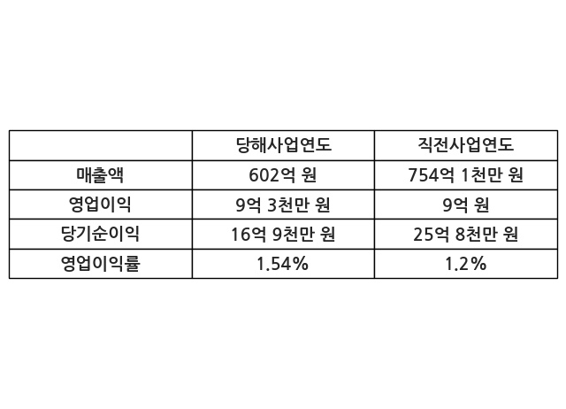이번사업연도의 매출액은 직전사업연도 대비 -20.17% 감소한 602억 원, 영업이익은 9억 3천만 원, 당기순이익은 16억 9천만 원이라고 공시했다.