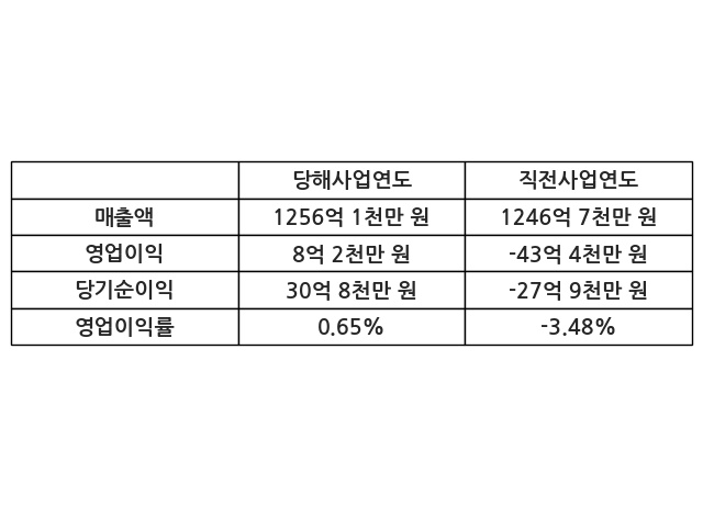 이번사업연도의 매출액은 직전사업연도 대비 0.75% 증가한 1256억 1천만 원, 영업이익은 8억 2천만 원, 당기순이익은 30억 8천만 원이라고 공시했다.