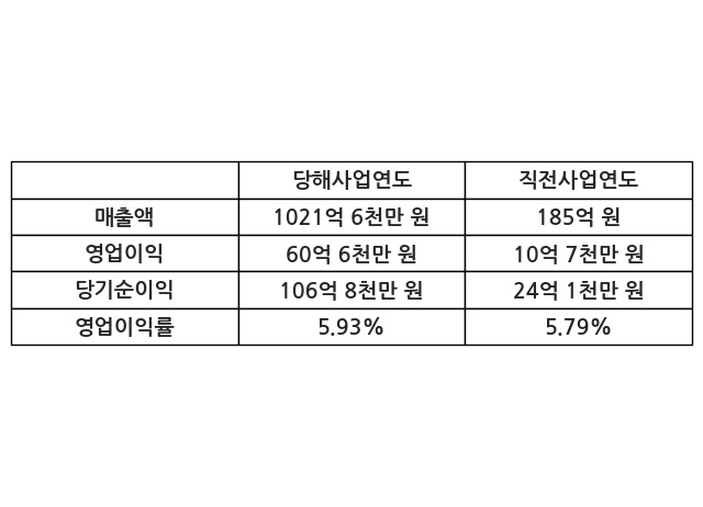 이번사업연도의 매출액은 직전사업연도 대비 452.22% 증가한 1021억 6천만 원, 영업이익은 60억 6천만 원, 당기순이익은 106억 8천만 원이라고 공시했다.