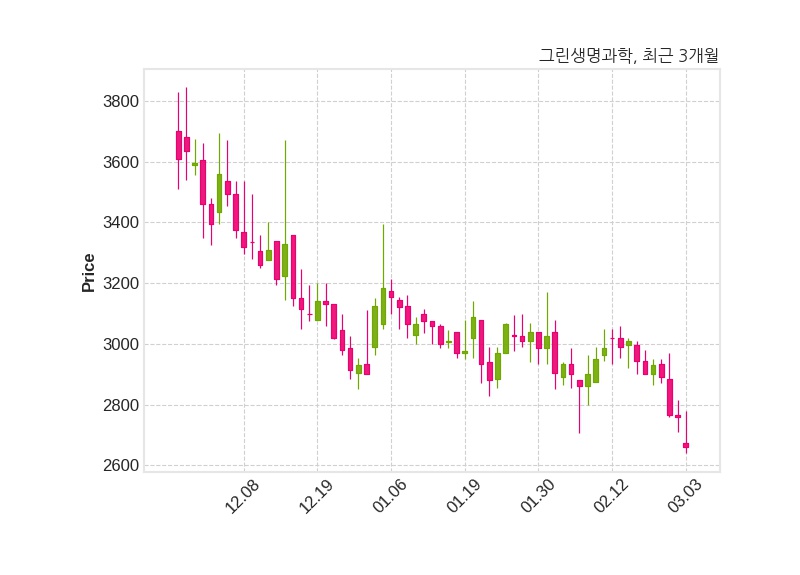 한편, 그린생명과학은 장 마감 이후 해당 기업공시를 발표했으며 오늘 종가가 2,660원, 거래량은 266,673주로, 직전 거래일 대비 100원(-3.62%) 하락했다.
