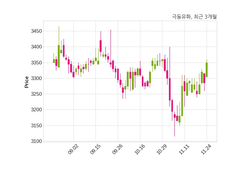 한편, 극동유화의 15시 14분 현재주가는 3,350원으로 직전 거래일 대비 65원(+1.98%) 상승이며, 거래량은 163,368주이다.