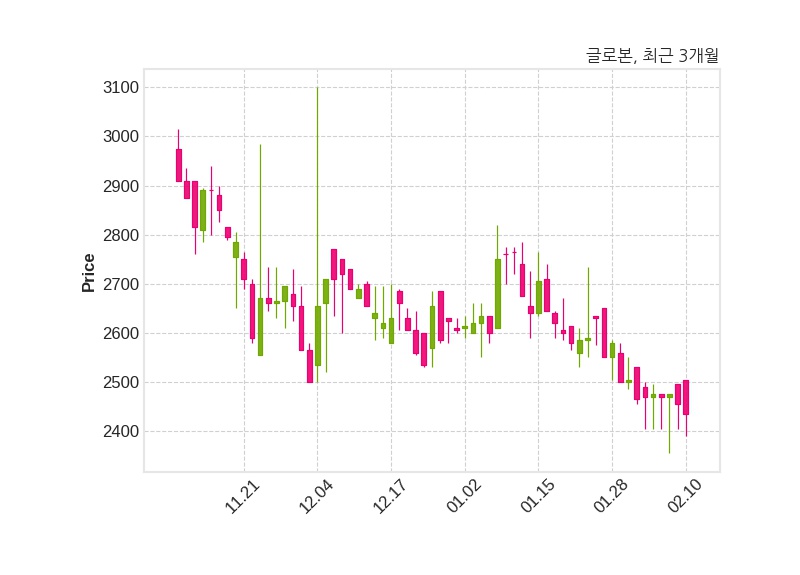 한편, 글로본의 14시 45분 현재주가는 2,435원으로 직전 거래일 대비 20원(-0.81%) 하락이며, 거래량은 48,839주이다.