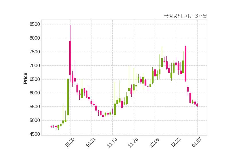 한편, 금강공업은 장 마감 이후 해당 기업공시를 발표했으며 오늘 종가가 5,540원, 거래량은 280,472주로, 직전 거래일 대비 40원(-0.72%) 하락했다.