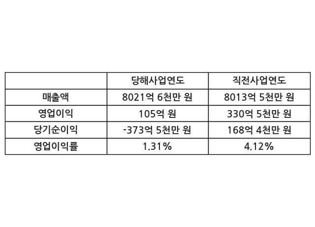 이번사업연도의 매출액은 직전사업연도 대비 0.1% 증가한 8021억 6천만 원, 영업이익은 105억 원, 당기순이익은 -373억 5천만 원이라고 공시했다.