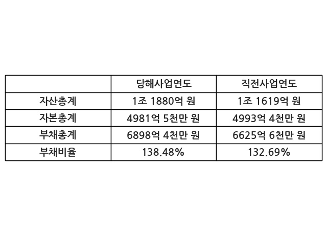 또한, 이번사업연도의 자산총계는 1조 1880억 원으로 직전사업연도 대비 2.25% 증가한 한편, 부채총계는 6898억 4천만 원으로 4.12% 증가, 자본총계는 4981억 5천만 원으로 -0.24% 감소했다.