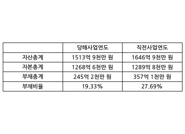 또한, 이번사업연도의 자산총계는 1513억 9천만 원으로 직전사업연도 대비 -8.08% 감소한 한편, 부채총계는 245억 2천만 원으로 -31.33% 감소, 자본총계는 1268억 6천만 원으로 -1.64% 감소했다.