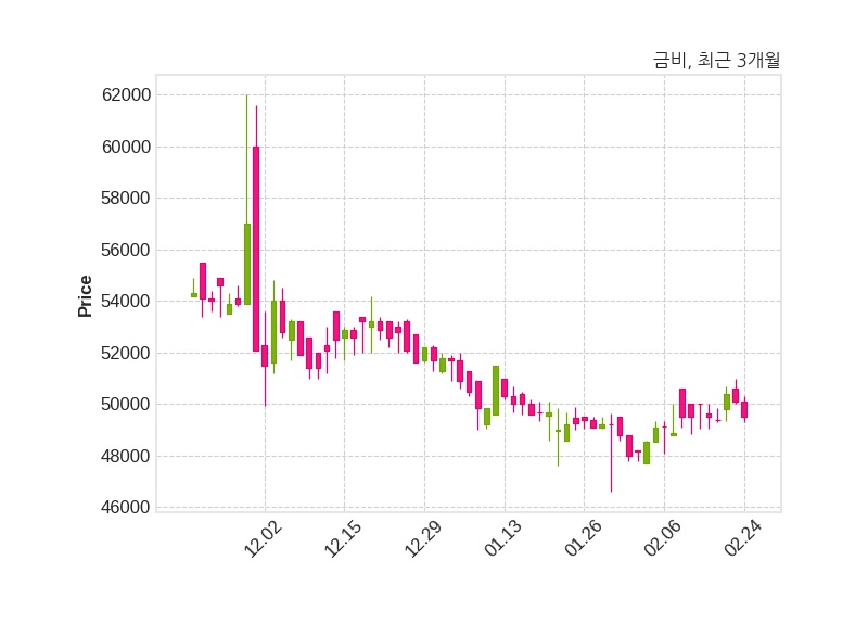 한편, 금비의 15시 27분 현재주가는 49,500원으로 직전 거래일 대비 600원(-1.2%) 하락이며, 거래량은 1,928주이다.