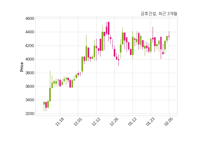 한편, 금호건설의 11시 33분 현재주가는 4,335원으로 직전 거래일 대비 5원(-0.12%) 하락이며, 거래량은 158,527주이다.
