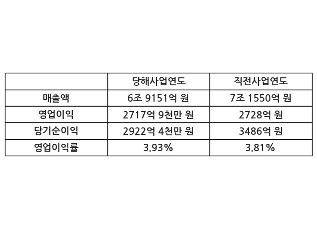 이번사업연도의 매출액은 직전사업연도 대비 -3.35% 감소한 6조 9151억 원, 영업이익은 2717억 9천만 원, 당기순이익은 2922억 4천만 원이라고 공시했다.