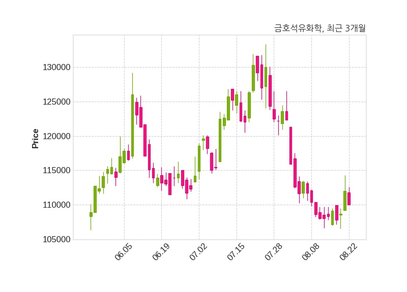 한편, 금호석유화학은 장 마감 이후 해당 기업공시를 발표했으며 오늘 종가가 110,000원, 거래량은 50,678주로, 직전 거래일 대비 2,000원(-1.79%) 하락했다.