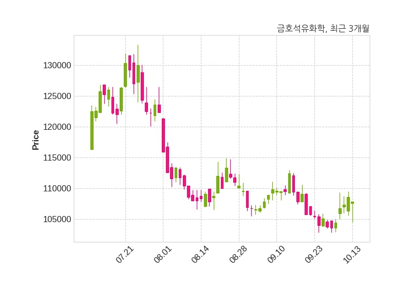 한편, 금호석유화학은 장 마감 이후 해당 기업공시를 발표했으며 오늘 종가가 107,800원, 거래량은 92,332주로, 직전 거래일 대비 800원(-0.74%) 하락했다.