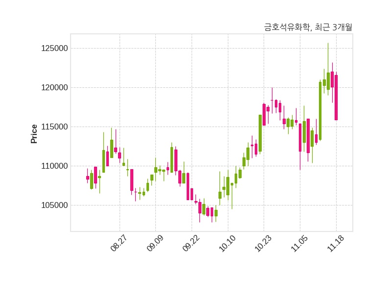 금호석유화학은 특별관계자 박찬구의 지분율이 17.53%에서 17.22%로 변동했다고 18일 공시했다. 한편, 금호석유화학은 장 마감 이후 해당 기업공시를 발표했으며 오늘 종가가 115,900원, 거래량은 68,952주로, 직전 거래일 대비 4,200원(-3.5%) 하락했다.
