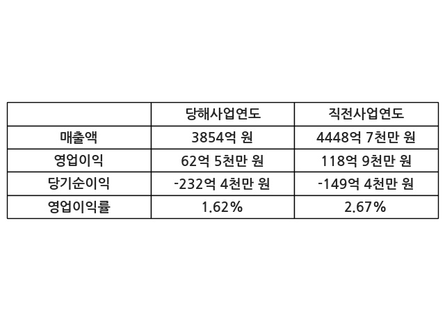 이번사업연도의 매출액은 직전사업연도 대비 -13.37% 감소한 3854억 원, 영업이익은 62억 5천만 원, 당기순이익은 -232억 4천만 원이라고 공시했다.
