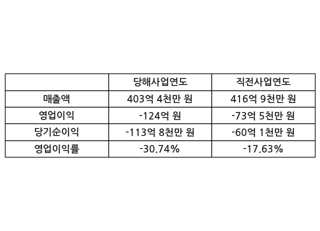 이번사업연도의 매출액은 직전사업연도 대비 -3.25% 감소한 403억 4천만 원, 영업이익은 -124억 원, 당기순이익은 -113억 8천만 원이라고 공시했다.