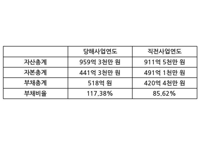 또한, 이번사업연도의 자산총계는 959억 3천만 원으로 직전사업연도 대비 5.24% 증가한 한편, 부채총계는 518억 원으로 23.2% 증가, 자본총계는 441억 3천만 원으로 -10.13% 감소했다.