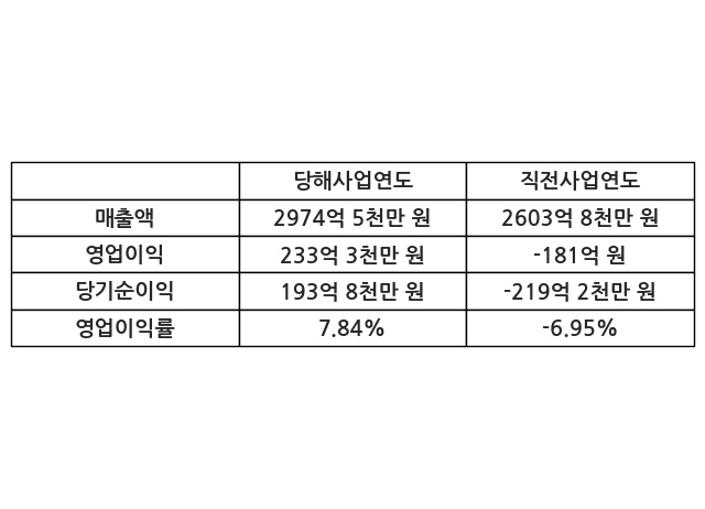 이번사업연도의 매출액은 직전사업연도 대비 14.24% 증가한 2974억 5천만 원, 영업이익은 233억 3천만 원, 당기순이익은 193억 8천만 원이라고 공시했다.
