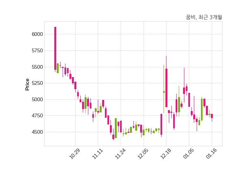 한편, 꿈비는 장 마감 이후 해당 기업공시를 발표했으며 오늘 종가가 4,720원, 거래량은 112,323주로, 직전 거래일 대비 55원(-1.15%) 하락했다.