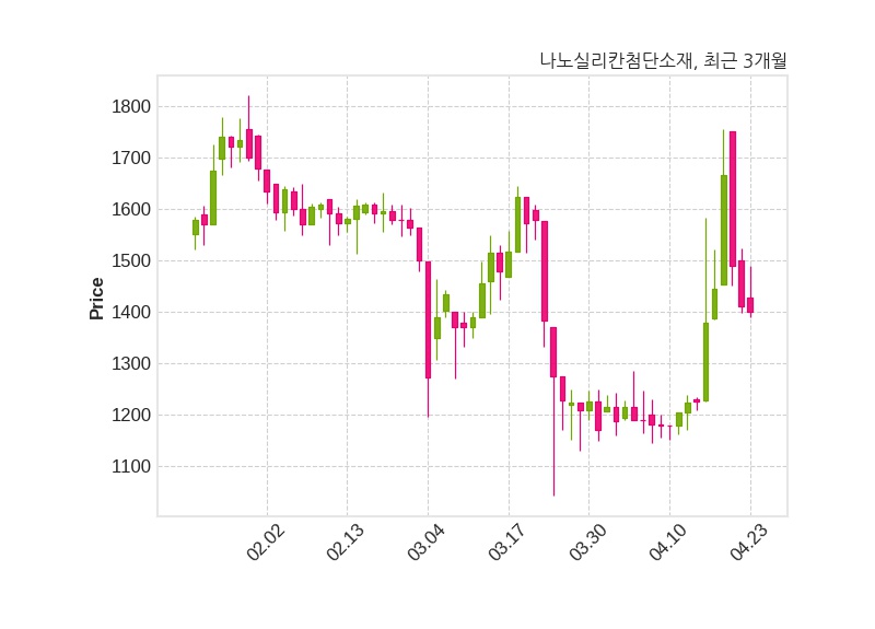 한편, 나노실리칸첨단소재는 장 마감 이후 해당 기업공시를 발표했으며 오늘 종가가 1,401원, 거래량은 253,290주로, 직전 거래일 대비 10원(-0.71%) 하락했다.
