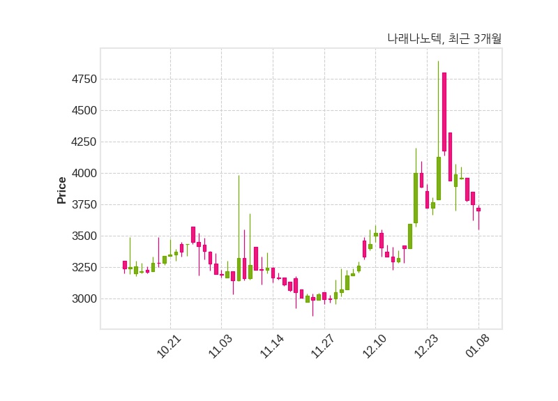 한편, 나래나노텍은 장 마감 이후 해당 기업공시를 발표했으며 오늘 종가가 3,700원, 거래량은 40,543주로, 직전 거래일 대비 50원(-1.33%) 하락했다.