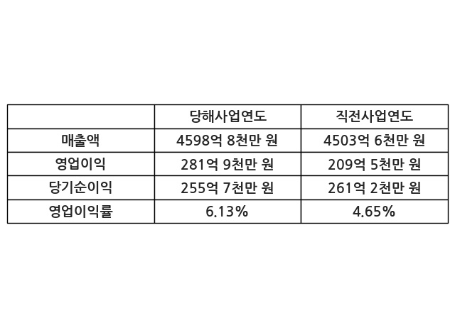 이번사업연도의 매출액은 직전사업연도 대비 2.11% 증가한 4598억 8천만 원, 영업이익은 281억 9천만 원, 당기순이익은 255억 7천만 원이라고 공시했다.