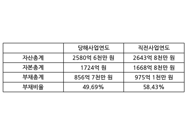 또한, 이번사업연도의 자산총계는 2580억 6천만 원으로 직전사업연도 대비 -2.39% 감소한 한편, 부채총계는 856억 7천만 원으로 -12.14% 감소, 자본총계는 1724억 원으로 3.31% 증가했다.