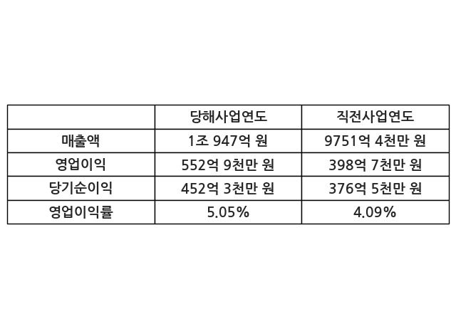 이번사업연도의 매출액은 직전사업연도 대비 12.26% 증가한 1조 947억 원, 영업이익은 552억 9천만 원, 당기순이익은 452억 3천만 원이라고 공시했다.