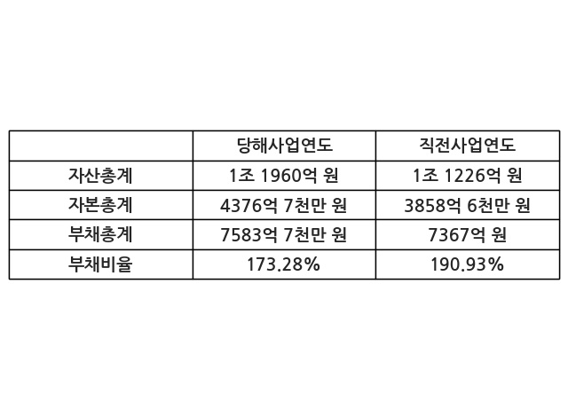 또한, 이번사업연도의 자산총계는 1조 1960억 원으로 직전사업연도 대비 6.55% 증가한 한편, 부채총계는 7583억 7천만 원으로 2.94% 증가, 자본총계는 4376억 7천만 원으로 13.43% 증가했다.