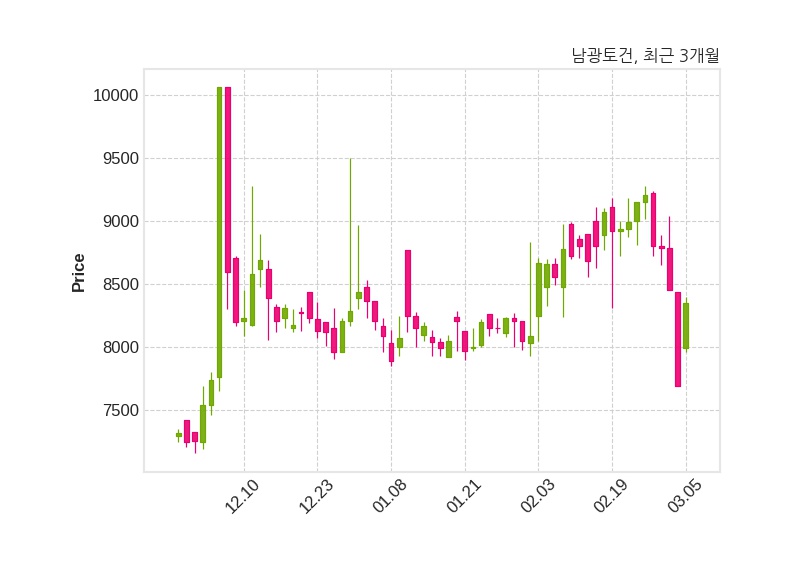 한편, 남광토건의 09시 32분 현재주가는 8,350원으로 직전 거래일 대비 660원(+8.58%) 상승이며, 거래량은 10,649주이다.