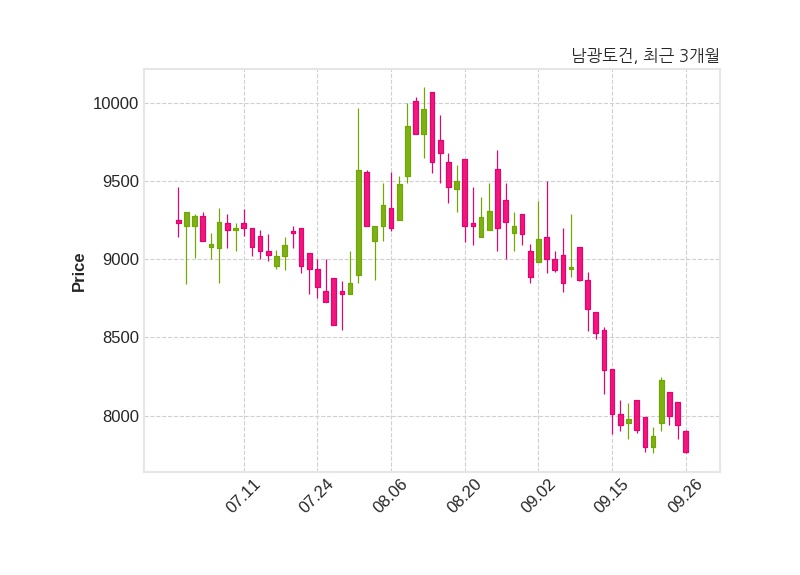 한편, 남광토건은 장 마감 이후 해당 기업공시를 발표했으며 오늘 종가가 7,770원, 거래량은 17,771주로, 직전 거래일 대비 170원(-2.14%) 하락했다.