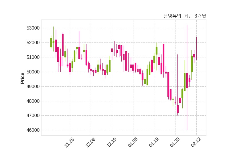 한편, 남양유업은 장 마감 이후 해당 기업공시를 발표했으며 오늘 종가가 51,000원, 거래량은 3,795주로, 직전 거래일 대비 변동이없다.