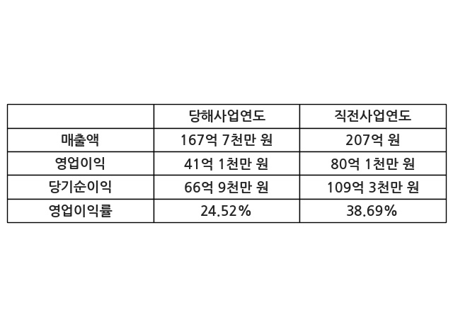 이번사업연도의 매출액은 직전사업연도 대비 -18.99% 감소한 167억 7천만 원, 영업이익은 41억 1천만 원, 당기순이익은 66억 9천만 원이라고 공시했다.
