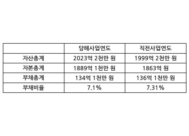 또한, 이번사업연도의 자산총계는 2023억 2천만 원으로 직전사업연도 대비 1.2% 증가한 한편, 부채총계는 134억 1천만 원으로 -1.48% 감소, 자본총계는 1889억 1천만 원으로 1.4% 증가했다.